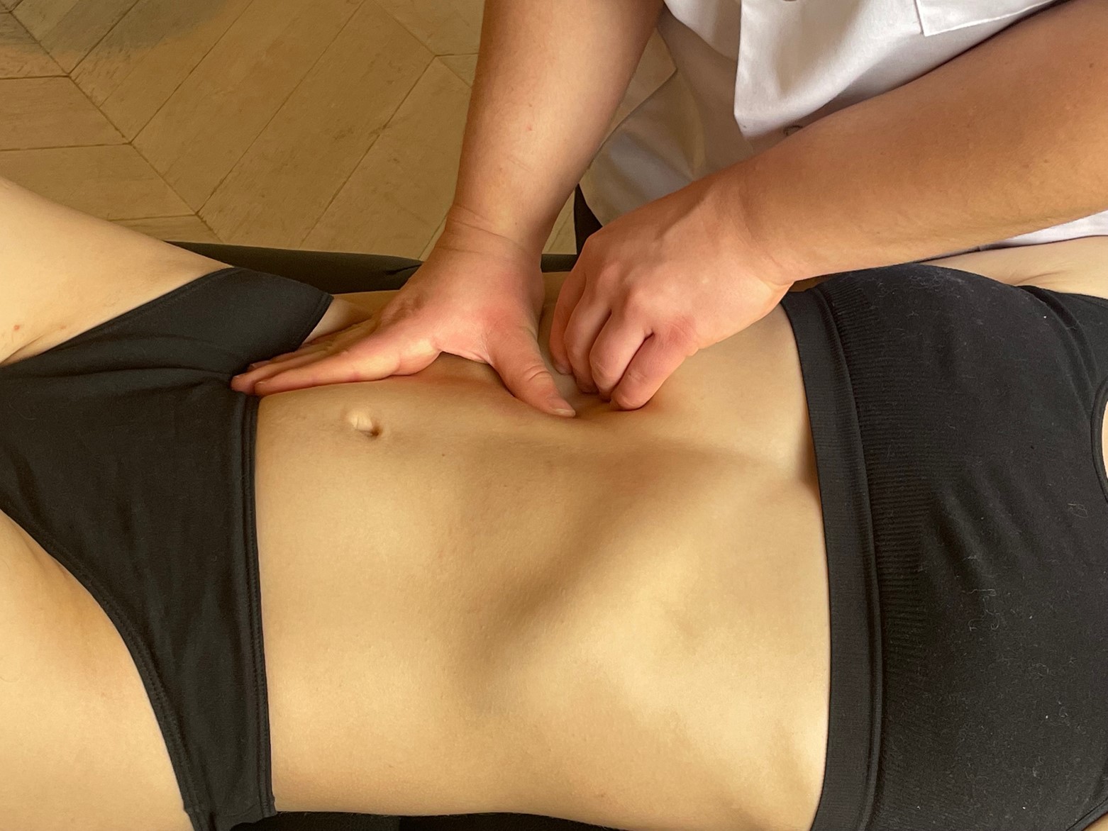 – Sur une inspiration, tracter le colon transverse en haut et à gauche. Demander une rotation gauche de tronc et une inclinaison droite pour majorer l’ouverture de l’angle de l’angle droit. A l’expiration, maintenir.