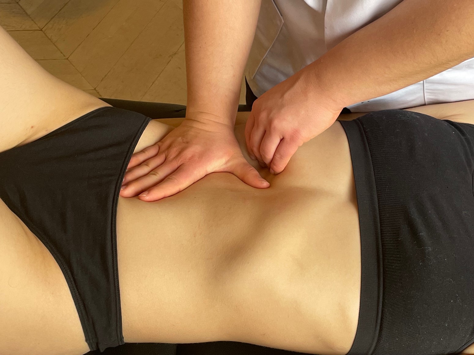 Thérapeute : Debout à l’arrière du patient. Les deux mains viennent au contact de l’angle colique droit.