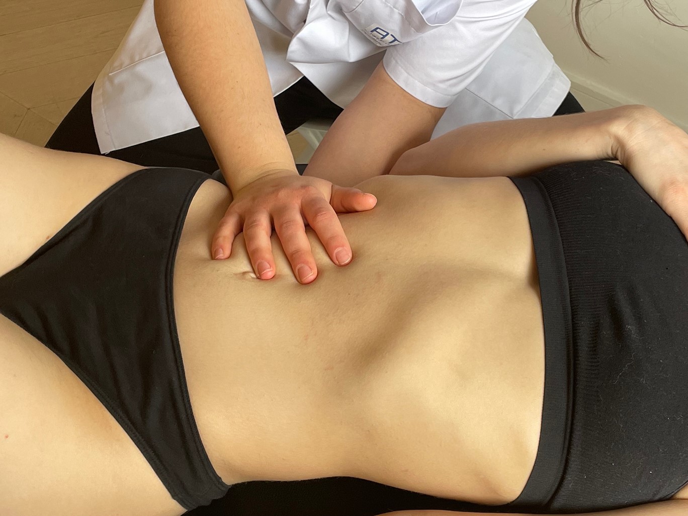 Thérapeute : Assis à droite du patient. Main gauche sous le dos du patient, pulpes des doigts sur les faces gauches des épineuses lombaires. Main droite sur bord externe du colon ascendant le plus large possible.