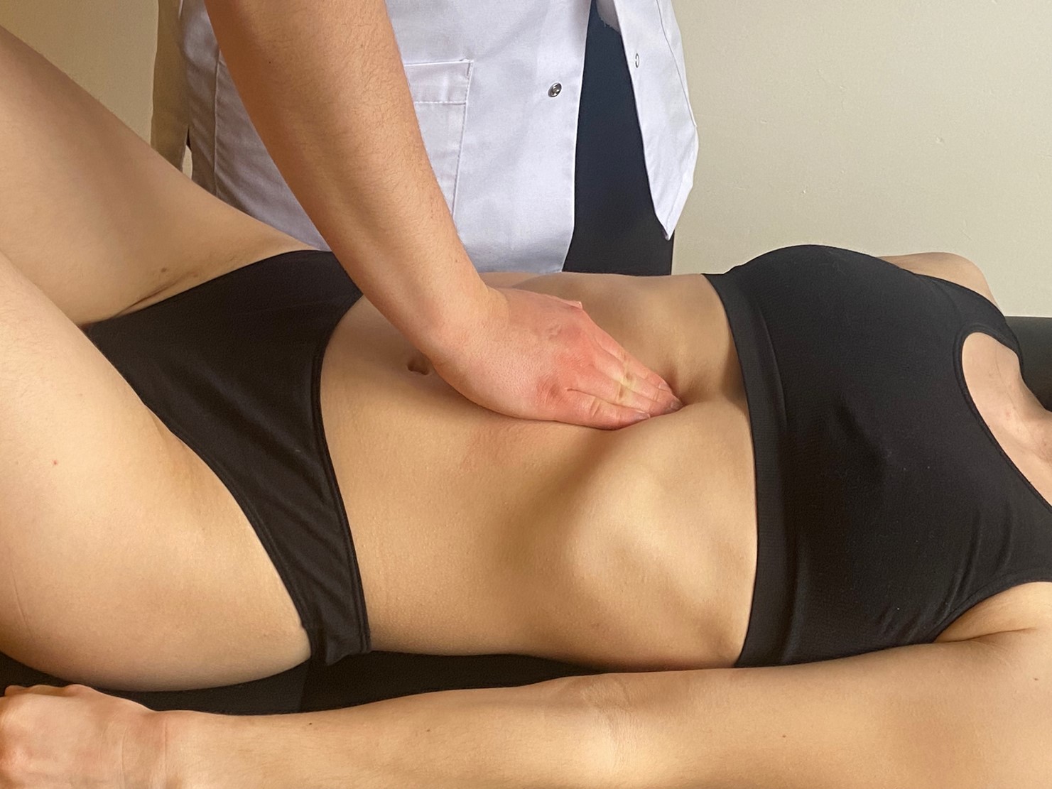 | Racine du mésocolon transverse | Patient : Décubitus, jambes en triple flexion. Thérapeute : Debout, latéralement au patient en direction de la tête. Les mains remontent le long des gouttières duodéno-coliques, sous les rampes chondrales à la recherche des angles coliques. Action : Étirement dans le plan frontal. |
