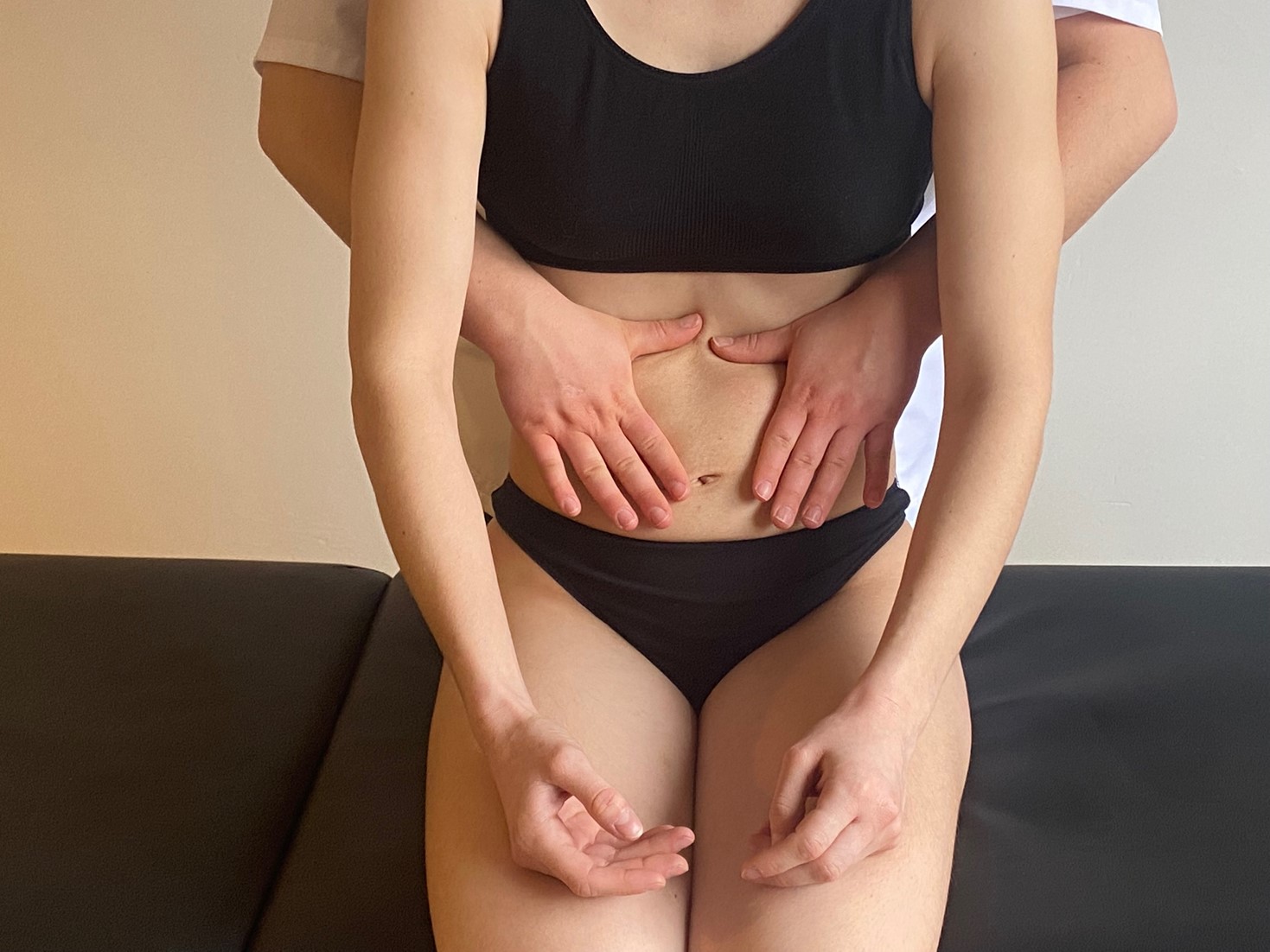 | Test de rebond en position assise | Patient : Assis. Thérapeute : Debout, à l’arrière du patient. Les deux mains remontent le long des gouttières duodéno-coliques, sous les rampes chondrales à la recherche des angles coliques. Action : Remonter les angles coliques sous le diaphragme le plus possible. Effectuer un test du rebond en relâchant ses deux mains de manière vive sans perdre le contact. Interprétation : deux possibilités : Temps de latence entre le moment où on lâche et où l’on réceptionne de nouveau les angles coliques ; Aucun temps de latence : les angles coliques « restent » dans les mains, le test de rebond est positif à Présence d’une ptose. Correction : Effectuer une succession de rebonds dans la même position que le test. ![]() |
