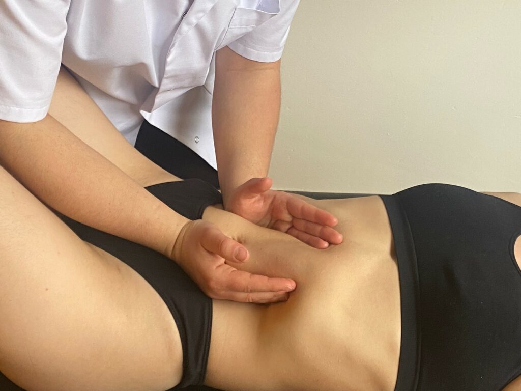 Thérapeute : Debout latéralement au patient. Le tranchant des 2 mains se placent en péri-ombilical, relativement superficiel sur la couche sous-cutanée.