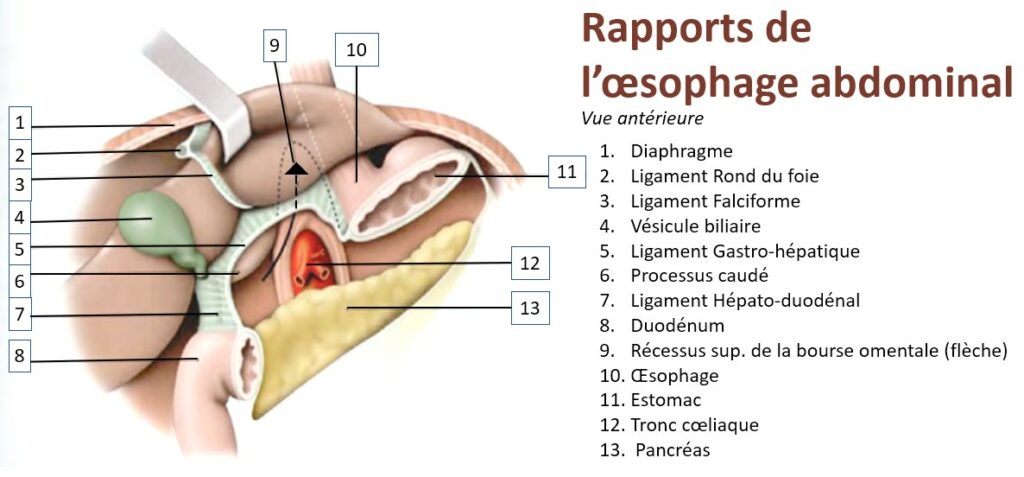 Figure 5.6. Rapports de l’œsophage abdominale (vue antérieure). Anatomie Clinique – Tome 3 – Pierre KAMINA