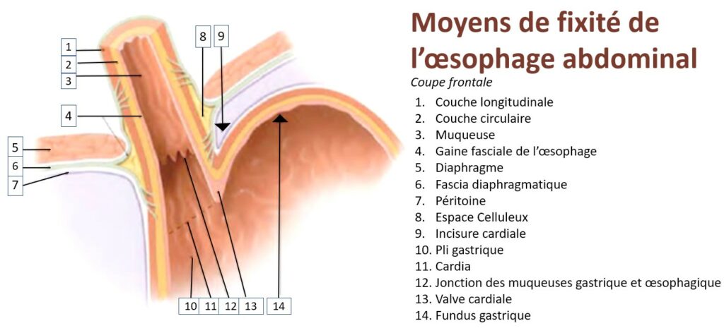 Figure 5.4. Moyens de fixité de l’œsophage abdominal (coupe frontal). Anatomie Clinique – Tome 3 – Pierre KAMINA