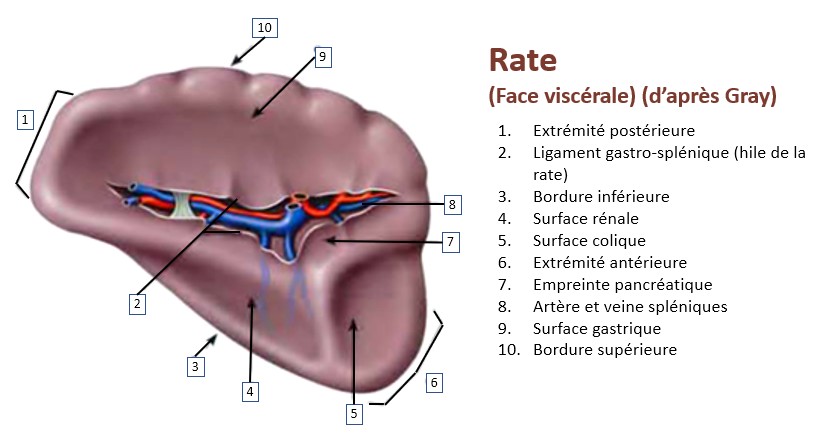 De couleur violacée, la rate pèse 200 g et mesure 12 cm de haut, 7 à 8 cm de large et 4 cm d’épaisseur.