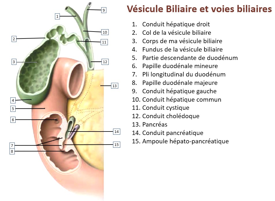 Le canal cholédoque mesure environ 6 cm descend le long de la face postérieure du pancréas dans une gouttière, puis il s’abouche au pancréas avec le canal pancréatique principal appelé canal de Wirsung.